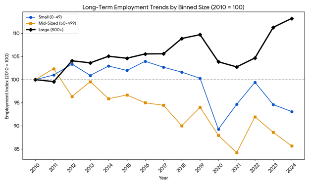 • Mid-Sized Firms (50–499): This segment has faced the steepest long-term decline, now operating at just 85.6% of its 2010 employment levels.